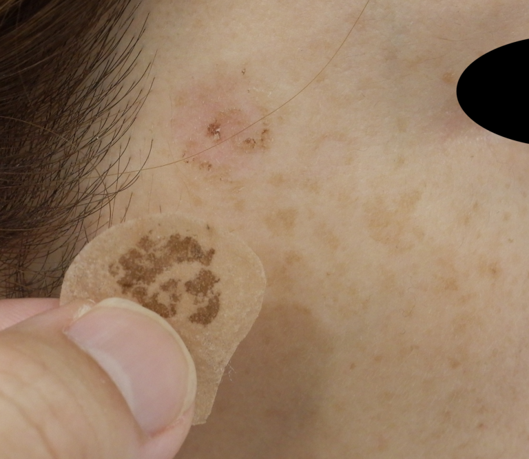 当院での1例です。老人性色素斑に対するピコスポットレーザー。施術後はテープ保護が約2週間必要になります。