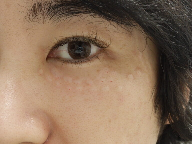 写真は、目の下へ「リジュランi」の注入直後の写真です。内出血(赤紫の小さなあざ)・ぽこぽこした小さな膨らみが数日続きます。翌日からメイク可能です。 「肌そのものを育てる」次世代の美肌注射で、サーモン由来のポリヌクレオチド(PN)を有効成分とし、真皮内から線維芽細胞を活性化してコラーゲン・エラスチン生成を促し、ハリ・弾力・キメを整え、クマ・シワ・くすみなどの改善を目的とした施術です。
